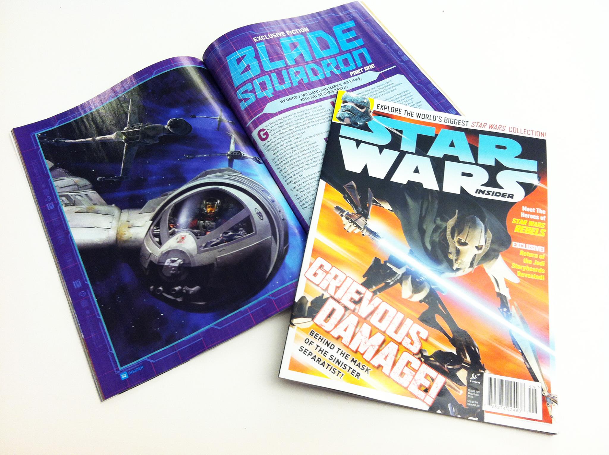 Wir haben euch ja von der zweiteiligen Kurzgeschichte Blade Squadron des Autorenduos David J. Williams und Mark S. Williams berichtet, die in den Star Wars Insider-Ausgaben #149 und #150 erscheinen wird (Mai bzw. Juni 2014) und während der Schlacht von Endor angesiedelt ist. Zu diesem B-Wing-Abenteuer hat die Facebook-Seite Star Wars Books einen neuen Teaser veröffentlicht, der den aufgeschlagenen Insider zeigt…