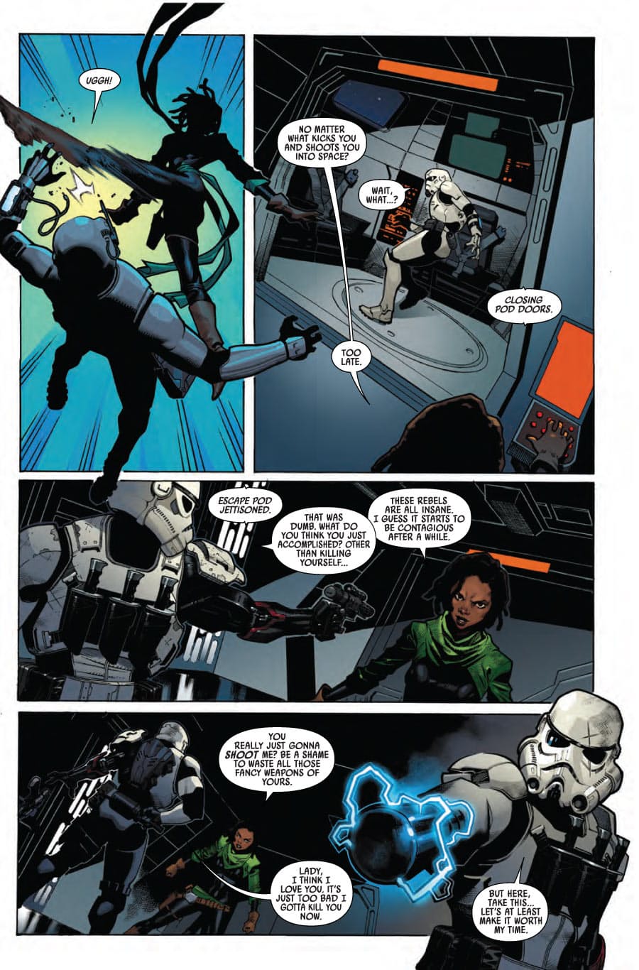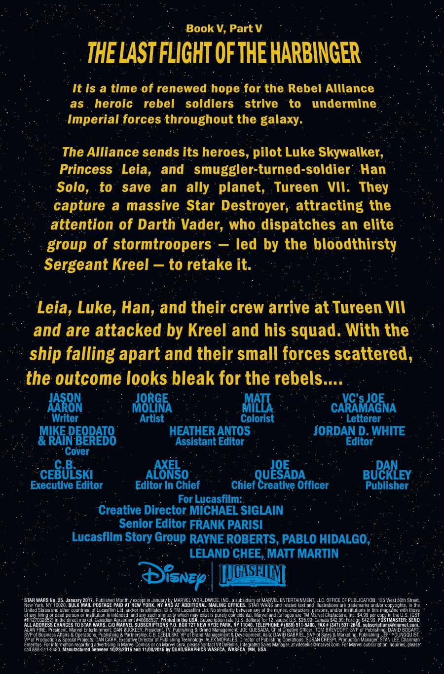 Nach einer schwarzweißen Vorschau und einer textfreien Artwork-Vorschau liefert Marvel nun via CBR eine fertige, geletterte Vorschau zu Star Wars #25. Das Heft erscheint nächste Woche in den USA und beendet den Handlungsbogen The Last Flight of the Harbinger, für den Autor Jason Aaron durch Zeichner Jorge Molina und Kolorist Matt Milla Verstärkung erhielt. Das Heft enthält auch eine von Chris Eliopoulos geschriebene und gezeichnete Bonusgeschichte rund um R2-D2. Das Cover stammt von Mike Deodato und erscheint auch als Sketch-Variante. Zudem liefert John Tyler Christopher ein Actionfiguren-Cover mit IG-88 und Terry Dodson ein exklusiv bei Mile High Comics erhältliches Variant mit Luke und Leia.
