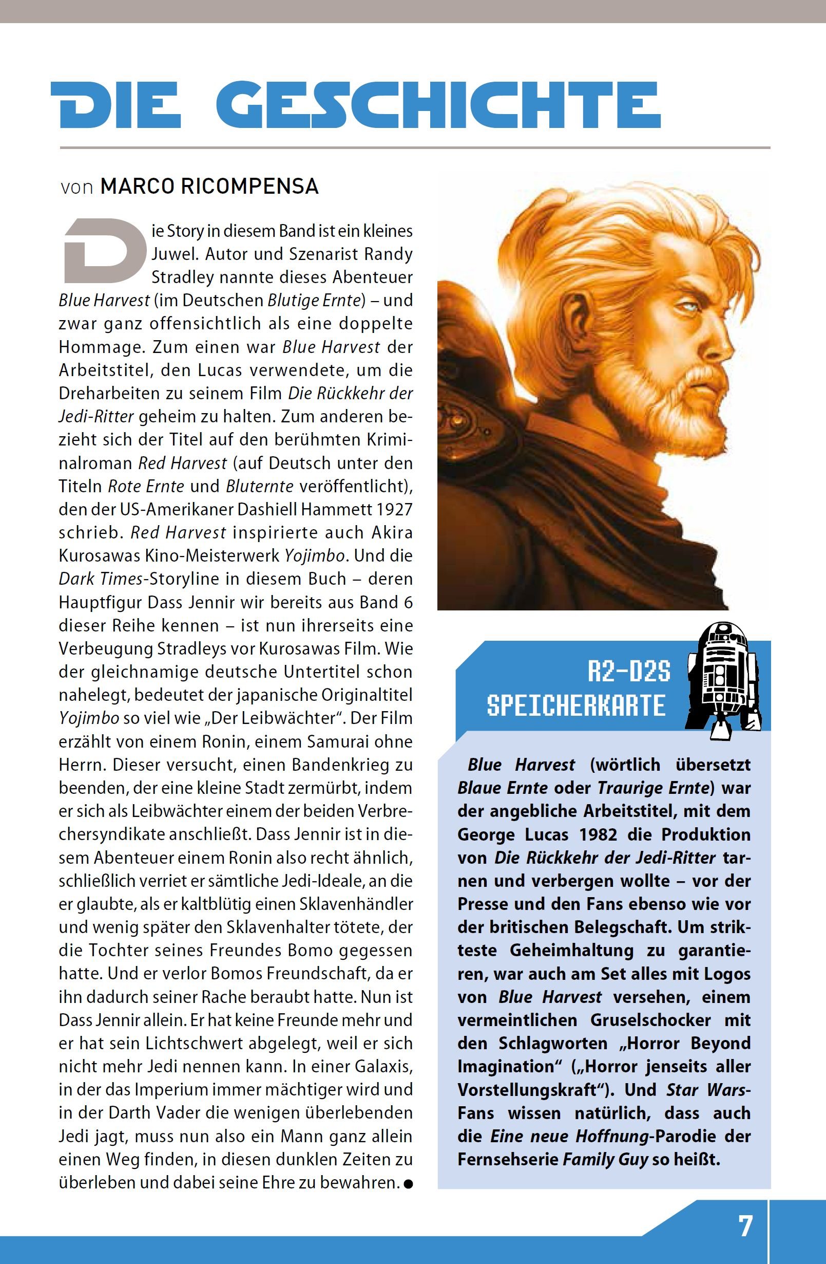 Auf Telerath lernt Dass Jennir derweil die gegenwärtige Lage kennen. Es gibt nicht nur eine kriminelle Bande, sondern gleich zwei. Einmal eine T’surr-Sklavenhändlerbande unter dem Kommando von Ken-Kiba und auf der anderen Seite die Gewürz schmuggelnden Chagrianer, die von Musori geleitet wird. Gleich zu Beginn darf Jennir das sogenannte Schwertgesetz kennenlernen, das auf dem Planeten gilt. Demzufolge dürfen Streitigkeiten nur mit dem Schwert geregelt werden und nicht mit dem Blaster. Musori klingt nicht nur dem Namen nach japanisch angehaucht, seine Bande ist es auch. Allen voran Mors Demanna, der gleich mal wie ein klassischer Samurai auftritt und auch den gesamten Comic über vor allem von seiner Ehre spricht. Das Szenario an sich ist sehr interessant, insbesondere weil Jennir sich dann natürlich nicht an die Vereinbarung mit Ember halten will, sondern beide Banden gegeneinander ausspielen möchte. Die Idee ist natürlich nicht neu, im Bonusteil des Comics wird auch darauf eingegangen, dass das Vorbild hier ganz klar Akira Kurosawas Meisterwerk Yojimbo der Leibwächter ist. Kleine Randnotiz hier: Der Film gehört mit zu den Begründern des späteren Italowesterns, weshalb uns Blutige Ernte auch ein stückweit an Eine Handvoll Dollar erinnert. Dass Jennir gelingt es zwar, die zwei Banden gegeneinander aufzuhetzen, allerdings gerät er zwischen die Fronten, als ihn niemand anders als Ember an Ken-Kiba verrät, mit dem sie – wie sich herausstellt – auch noch einen Deal hat. Blutige Ernte ist reich an zwielichtigen Charakteren, von denen einer schlimmer als der letzte ist und vermittelt sehr gut das Bild einer Stadt, die im Kreuzfeuer der Kriminalität lebt, wo sich jeder selbst der nächste ist.