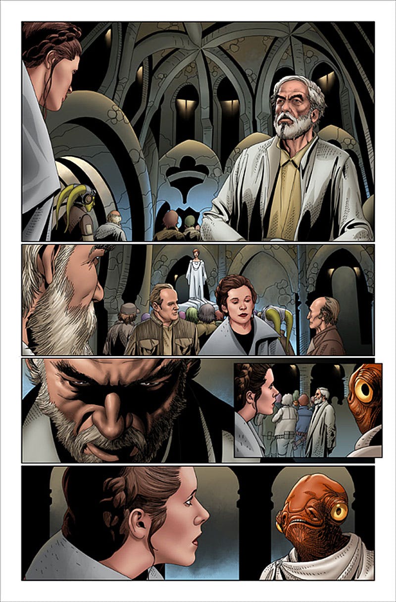 • Leia ist die Figur mit der größten Rolle in dieser Story. Han hat auch eine große Rolle, aber Luke ist hier eher eine Nebenrolle. Er wird aber im dritten Gillen-Handlungsbogen mehr zu tun bekommen und ist dennoch nicht gänzlich inaktiv in Mutiny at Mon Cala.