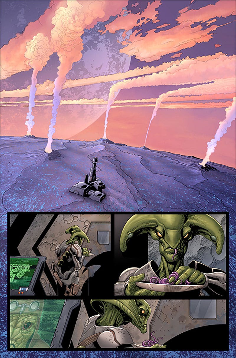 - Gillen stellt sich Mon Cala so vor: Es gibt einen imperialen Sektor-Moff, aber auch einen Regenten, der selbst ein Mon Cal ist. Er ist keine unsympathische Figur, wie man in Heft #44 bereits sehen durfte, doch nachdem Raddus und Ackbar – die er sehr bewunderte – gegangen sind, musste er den Planeten am Laufen halten. Er glaubt, das Volk zu beschützen. Die Kultur ist demilitarisiert. (Für Geschichts-Nerds: Gillen vergleicht Mon Cala mit Karthago zwsichen dem zweiten und dritten Punischen Krieg.) Dennoch hat Mon Cala die beste Handelsflotte der Galaxis, laut Gillens Einschätzung, und die würde die Rebellion gerne bewaffnen.