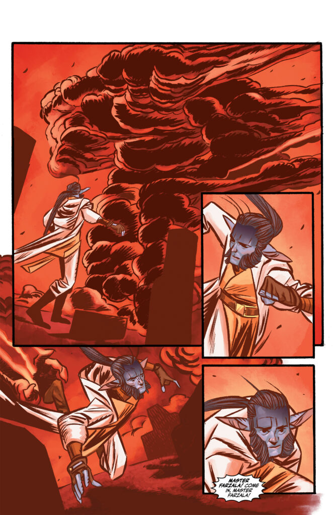 Ein Pluspunkt sind die klaren Zeichnungen von Toni Bruno, die auch in den Kampfszenen nicht überfrachtet wirken. Besonders gut hat mir die Darstellung von Sevran Tarkin gefallen, deren Körperhaltung sehr gut die wachsende Verzweiflung, aber auch Entschlossenheit widerspiegelt. Die ersten beiden Seiten, die wohl laut Lauftext „Bilder apokalyptischer Zerstörung“ zeigen sollen, welche Farzala als Visionen sieht, bleiben allerdings viel zu vage. Hier sieht man nur rote Hintergründe und Rauch. Unter Apokalypse stelle ich mir dann doch etwas Spektakuläreres vor. Wahrscheinlich sollen diese Bilder zeigen, was passiert, wenn der Warden den instabilen Lava-Reaktor trifft und die Stadt in die Luft fliegt, aber das wurde mir erst nach mehrmaligem Lesen klar.
