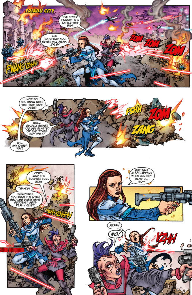 Seufz! – Nachdem in Heft #18 eigentlich der sich schon seit Ewigkeiten hinziehende Handlungsstrang The Jedi and the Warden zu Ende ging und damit auch eigentlich die unglaublich breitgetretene Schlacht von Eriadu enden sollte, geht es im heutigen Heft einfach weiter mit der Schlacht. Die Geschichte von Daniel José Older wird wie gewohnt illustriert von Zeichner Harvey Tolibao und Kolorist Michael Atiyeh.