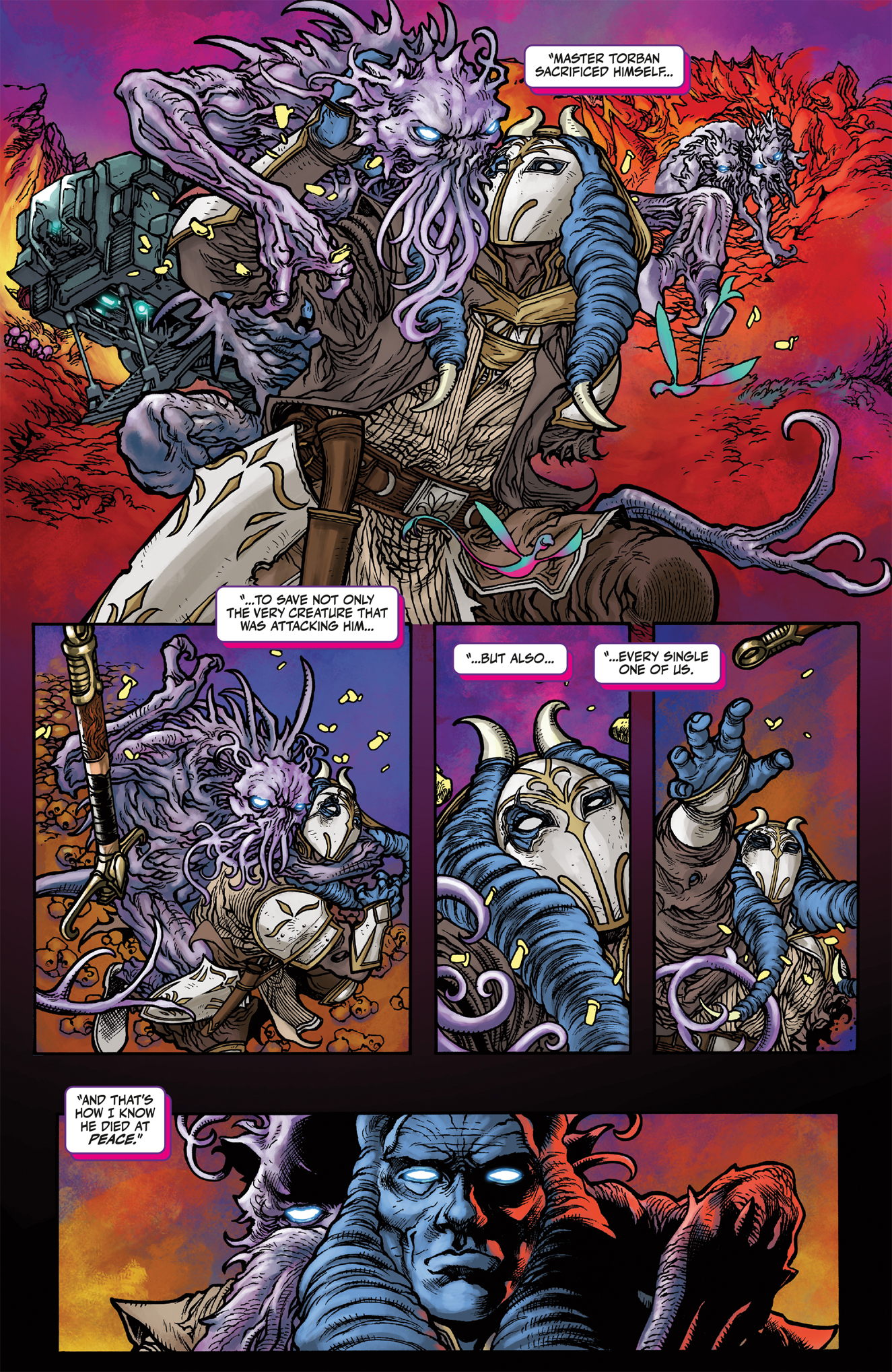 Dass Torban Buck hier nochmals gewürdigt wird, ist eine schöne Geste, da die Figur ja eigentlich ursprünglich aus dieser Comic-Reihe stammt. Dazu bekommen wir seine Todesszene, die wir seither nur in Trials of the Jedi lesen konnten, nun auch bildlich dargestellt. Dies sieht auch graphisch sehr beeindruckend aus. Gezeichnete Nameless in den Comics sind ja in ihrer ganzen Gruseligkeit immer ein Highlight. Allerdings dürfte für die eigentliche junge Zielgruppe des Comics, die Trials of the Jedi nicht gelesen hat, der Zusammenhang von Torbans Tod unklar bleiben. Es wird angedeutet, dass er sich für „uns alle“, also das Wohl der ganzen Galaxis, geopfert hat. Wer aber nur die Comics gelesen hat, kennt weder den Zusammenhang zwischen Blight und Nameless noch die Mission der Neun.