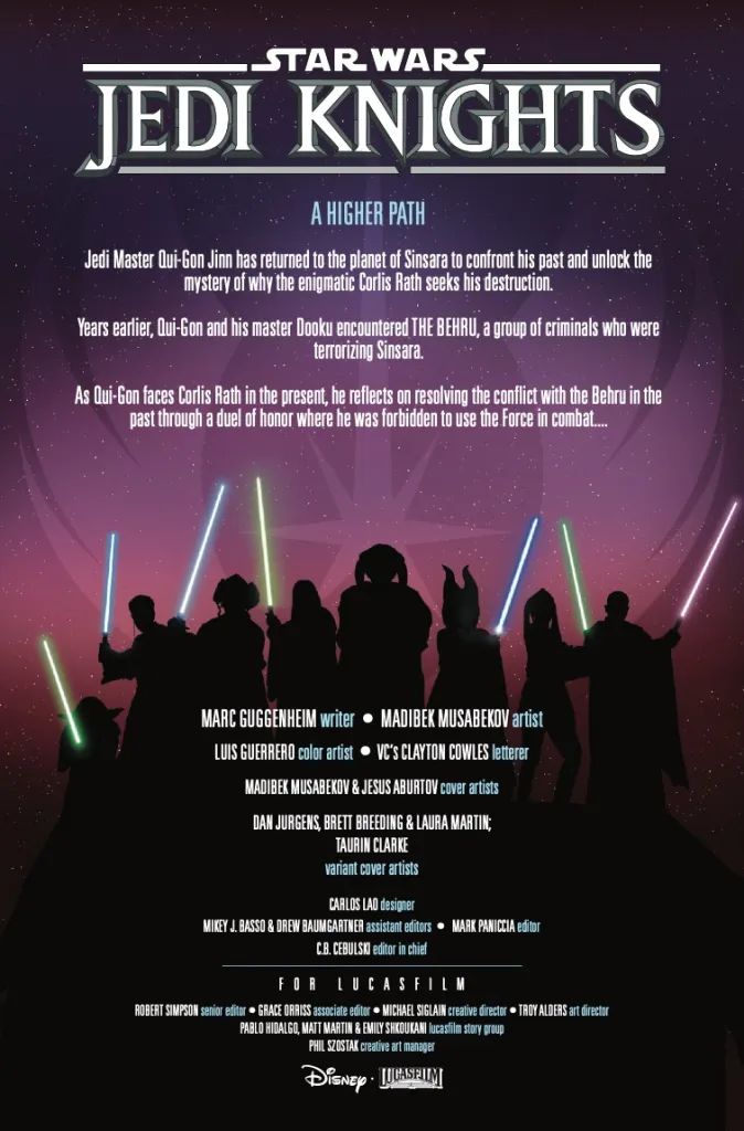 Zum Abschluss lässt der Autor Marc Guggenheim Qui-Gon endlich Corlis Rath gegenübertreten. Aber auch Obi-Wan und ein lange gehütetes Geheimnis spielen noch eine Rolle. Die Panels wurden wieder von Madibek Musabekov gezeichnet und von Luis Guerrero koloriert. Das Lettering wurde von Clayton Cowles beigesteuert.